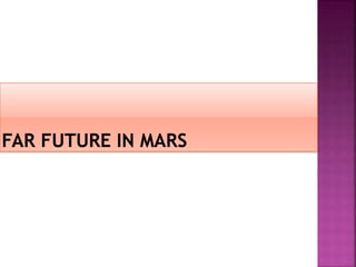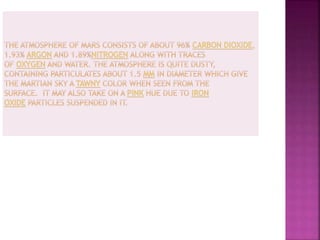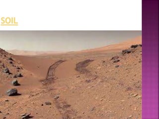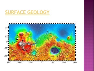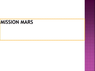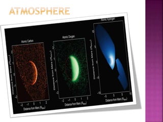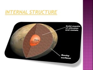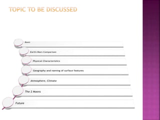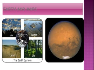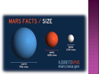 Mars is the fourth planet from the Sun and has characteristics that make it similar yet different from Earth. It has a thin atmosphere, seasonal changes, polar ice caps, the largest volcano in the solar system called Olympus Mons, and evidence of ancient rivers and lakes. Future missions are planned to further explore Mars, including the InSight lander in 2016 and Mars 2020 rover. The Curiosity rover has been exploring Gale Crater since 2012 and found environmental conditions that may have once supported microbial life.