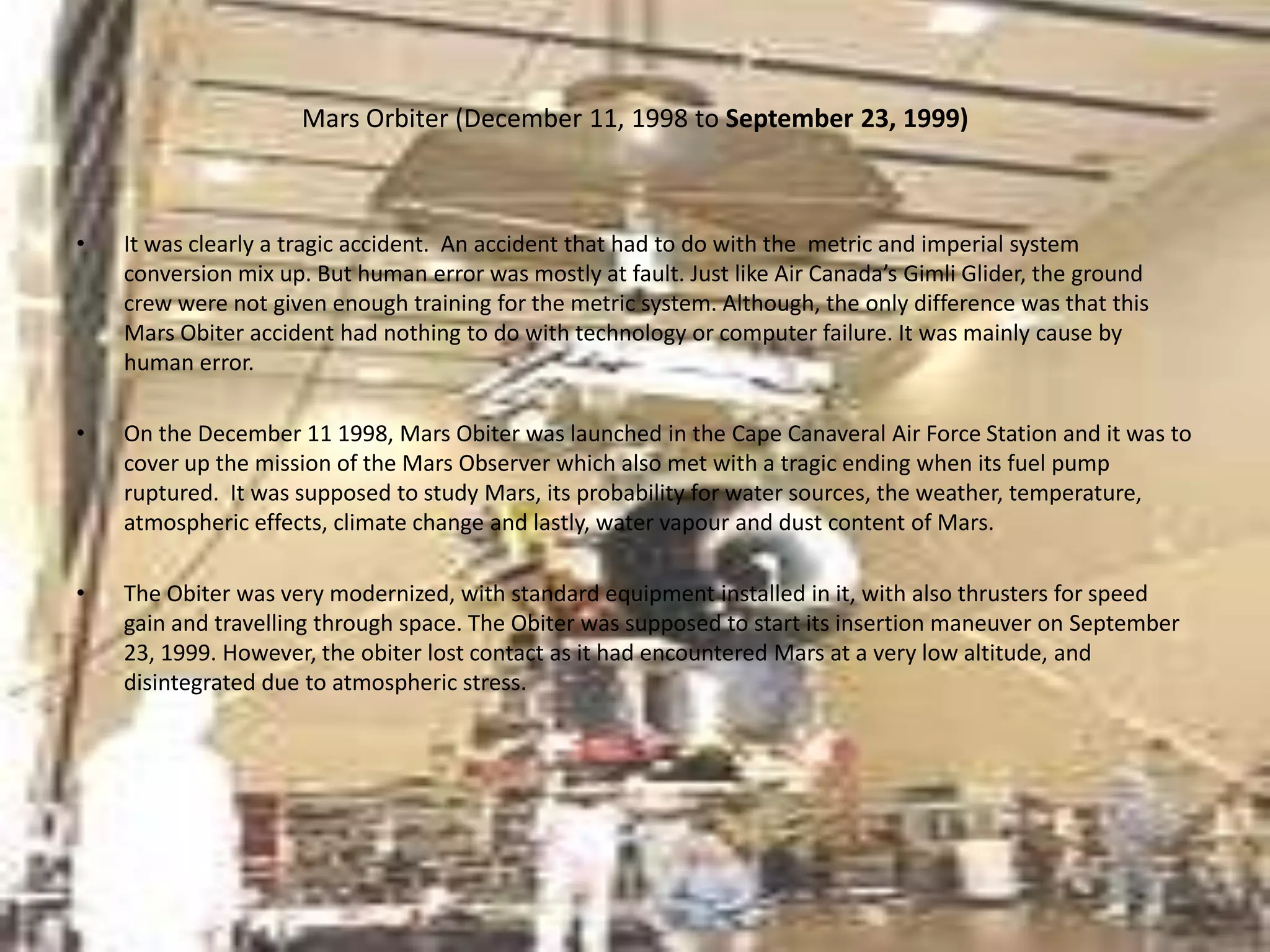 The Mars Climate Orbiter failed due to a metric-imperial unit conversion error. The spacecraft's software used metric units while ground teams entered data using imperial units, resulting in incorrect calculations that sent the orbiter too low into Mars' atmosphere, where it disintegrated. The failure was caused by human error in not ensuring consistent use of units across software and teams. It underscores the importance of strict protocols and training to prevent mistakes when using different measurement systems.