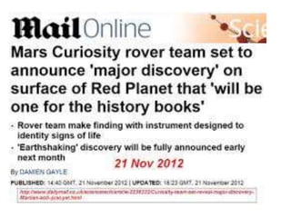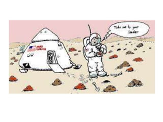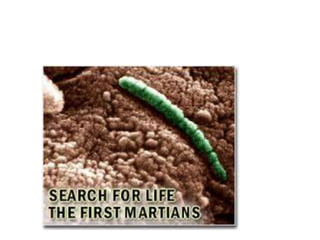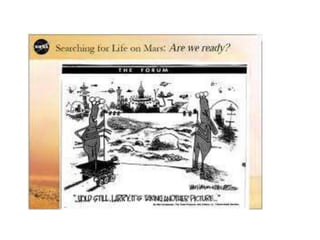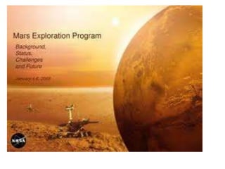 The document discusses the possibility of life on Mars and the exploration efforts to search for evidence. It notes that Mars' climate and surface age make it similar to early Earth and thus it may hold clues about the development of life. NASA missions have been searching for ancient life by looking for water and types of microorganisms. Understanding Mars could provide insights into Earth's history. There is also significant human curiosity to explore the red planet and search for answers to questions about its formation and the potential for life.