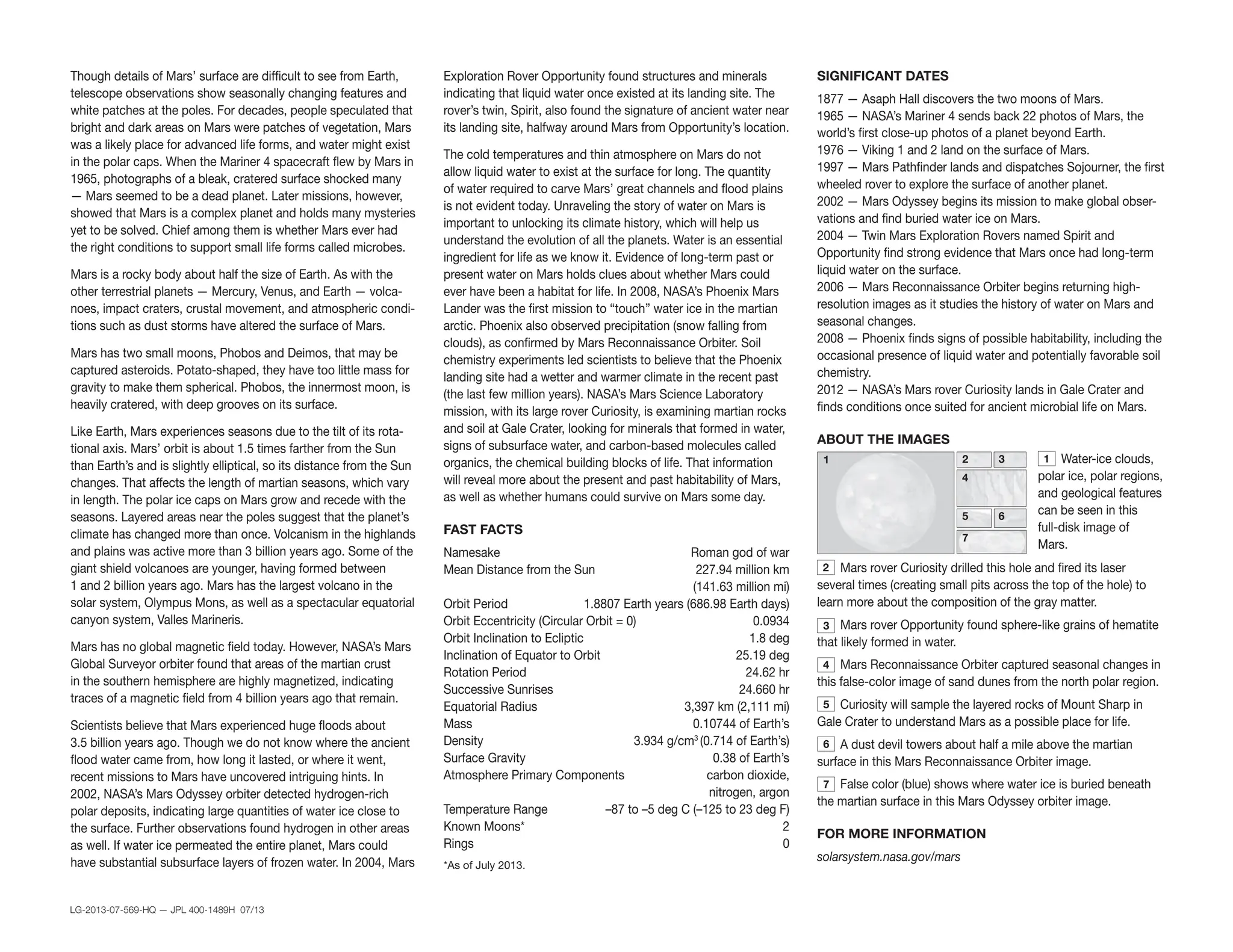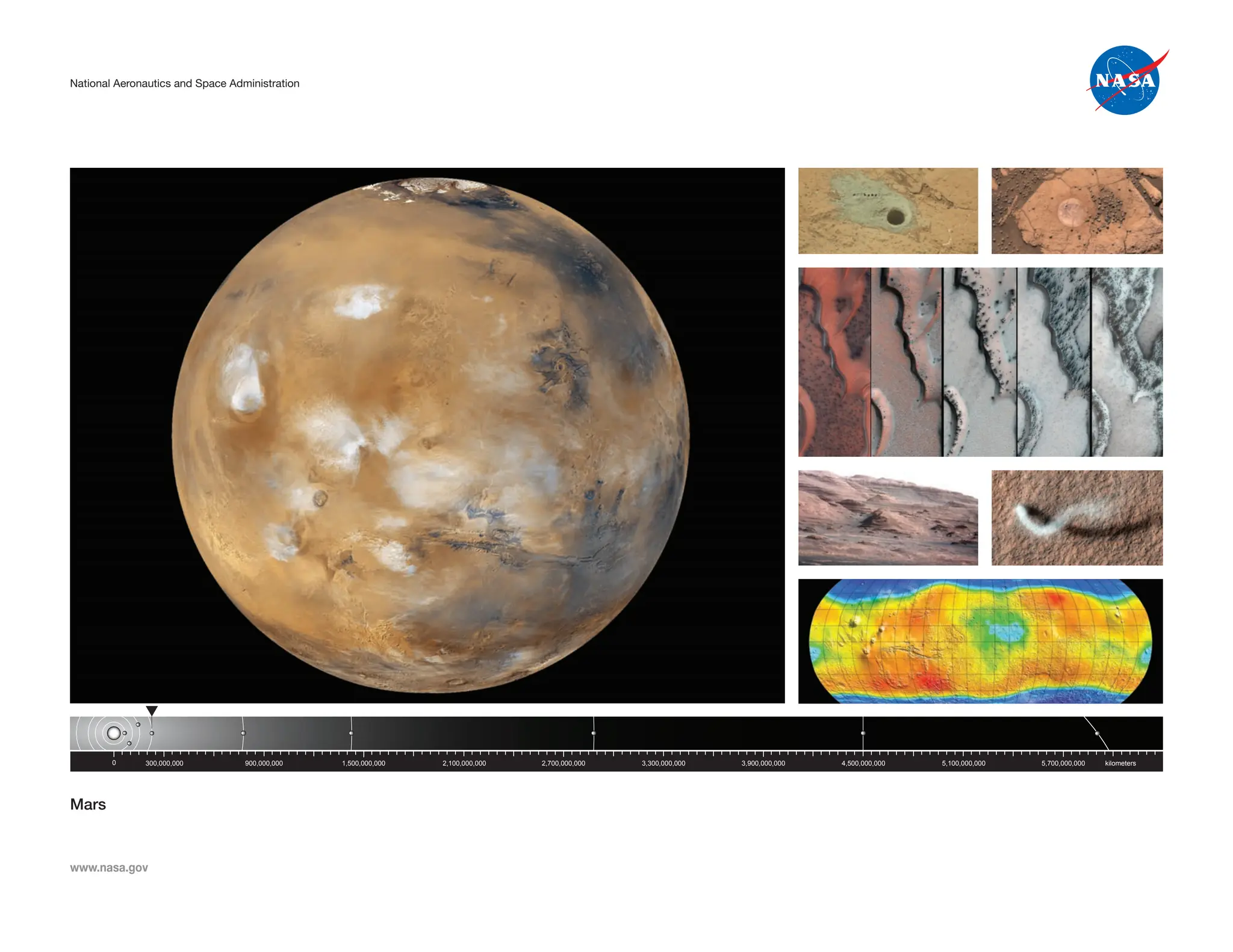 The document provides an overview of Mars, detailing its geological features, climate, and potential for supporting life. It discusses historical missions by NASA that revealed evidence of past water presence, surface conditions, and the planet's complex environment. It highlights Mars' two moons, polar ice caps, volcanic activity, and ongoing exploration to understand its habitability and geological history.