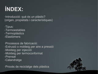 ÍNDEX: ·Introducció: quèés un plàstic? (origen, propietats i característiques) ·Tipus: -Termoestables -Termoplàstics -Elastòmers ·Processos de fabricació: -Extrusió o moldeig per aire a pressió -Moldeig per injecció -Moldeig per termoconformat -Prensat -Calandratge ·Procés de reciclatge dels plàstics