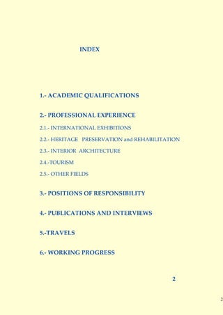 The document is a curriculum vitae for Marta Medina Muro Benjumea. It outlines her academic qualifications including degrees in history of art and interior architecture. It then details her extensive professional experience coordinating international exhibitions, preserving heritage sites, practicing interior architecture, and working in tourism. It also lists positions of responsibility she has held and publications and interviews related to her work.