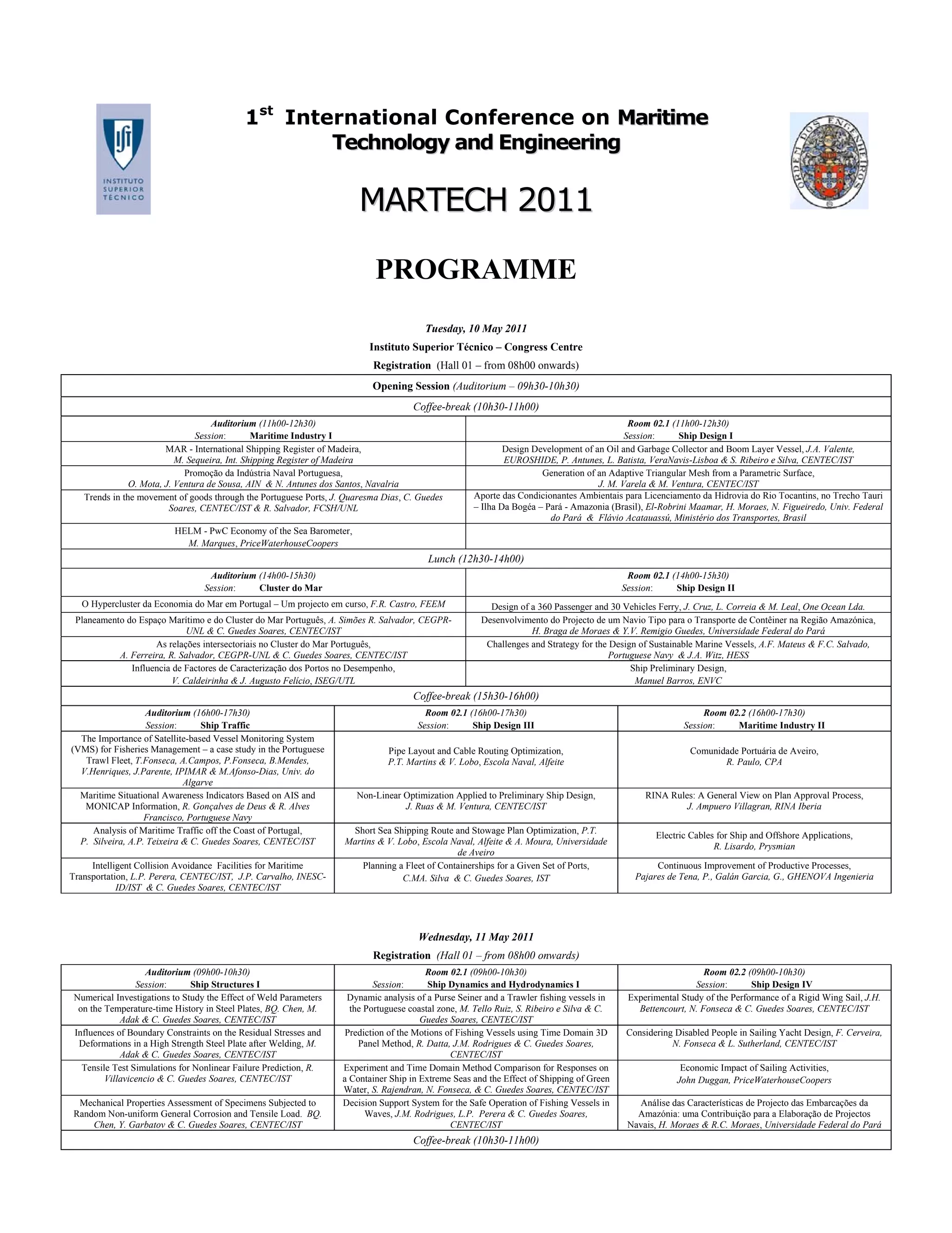 This document provides the programme for the 1st International Conference on Maritime Technology and Engineering (MARTEC 2011) taking place on May 10-12, 2011 in Lisbon, Portugal. The conference consists of sessions covering topics such as ship structures, ship dynamics, renewable energies, and sustainable ships. It includes presentations, speakers, topics, and schedules for each day of the conference.