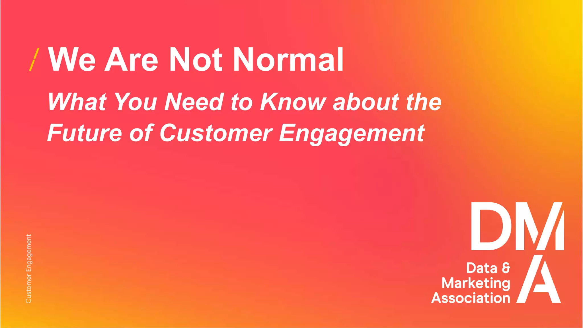 This document discusses the future of customer engagement based on research from the DMA. It finds that while email is still a preferred marketing channel, influence comes from many sources. Trust is built through relevance, data privacy, and establishing a good reputation. Emerging technologies like smart home assistants and social/shoppable ads are gaining ground but influence remains broad. The key pillars for effective customer engagement are identified as relevance, data privacy practices, and trust.