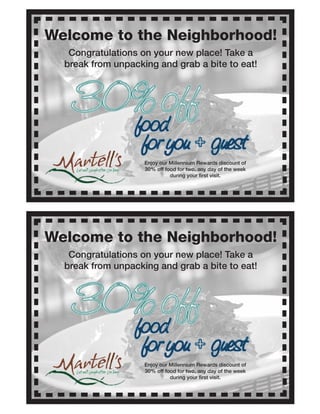 This document provides information about Martell's restaurant located in Kalamazoo, Michigan. It welcomes new neighbors to the area and encourages them to visit for a 30% discount on their first visit. Reservations are accepted but not required and casual attire is welcome. The restaurant is open daily from 11:30am-11:00pm and offers discounts to members every Monday.