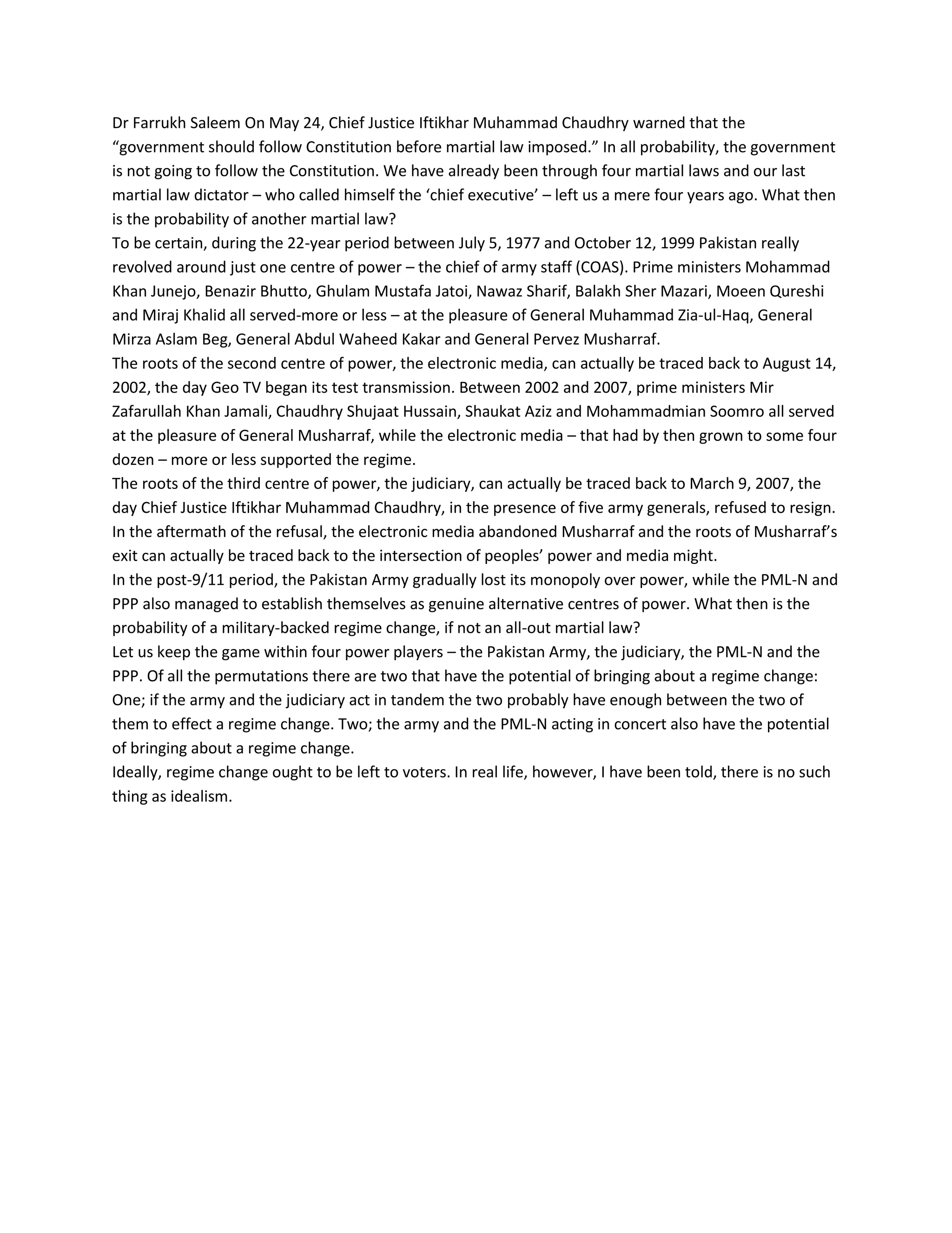 The document discusses the history of power centers in Pakistan and the possibility of another martial law or military-backed regime change. It notes that Pakistan has had 4 martial laws previously and the last military dictator left power only 4 years ago. It analyzes that the army, judiciary, PML-N party, and PPP party are the four main current power players and that a regime change could potentially occur if the army allied with either the judiciary or PML-N. However, ideally regime changes should be decided by voters rather than other means.