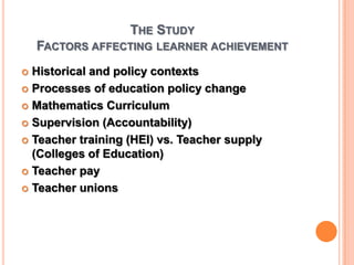 This document summarizes a study comparing factors affecting learner achievement in mathematics education between Botswana and South Africa. Some key findings are that Botswana learners scored higher on mathematics tests and had more lessons compared to South Africa. The quality of teachers, their mathematics knowledge and pedagogical skills differed between the countries as did opportunities for students to learn the curriculum. The study recommends increasing instructional time in mathematics, improving teacher training, developing a culture of mathematics, and monitoring implementation of reforms rather than simply increasing resources.