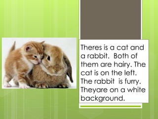 The document contains descriptions of various scenes and objects: a cat and rabbit on a white background, a red car on a road with mountains and trees in the center, a modern house with a swimming pool, hammocks, and tree in front, a warship carrying planes in a harbor near a city, a forest waterfall with trees and a bridge, and a white plane flying in the sky with clouds.
