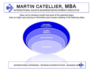 The document is a presentation by Martin Catellier, a senior sales executive with over 10 years of experience managing international sales and business development. He offers his expertise in diversifying revenue through global market expansion. Catellier has a proven track record of exceeding sales targets and has experience leading sales teams, negotiating deals, and establishing new markets and partnerships around the world. He is inviting the recipient to discuss how he can help their organization grow internationally.