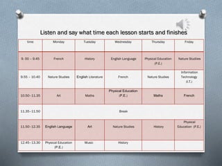 Martin's schedule lists the subjects he takes each day of the week, including French, English, history, art, math, physical education, and nature studies. The schedule provides the start and end times for each lesson on Monday through Friday. The document also contains exercises related to analyzing timetables, coming up with words from letters, matching subjects to activities, and filling in blanks in a short text.