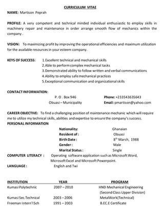 Martison Peprah is seeking a position as a maintenance mechanic. He has over 10 years of experience in machinery repair and maintenance for mining and construction equipment. His experience includes work with Sandvik, Caterpillar, Normet, and Anglogold Ashanti machines. He has strong technical skills in mechanical tasks, communication skills, and safety practices. He holds an HND in Mechanical Engineering and certificates in metal work and technical education.