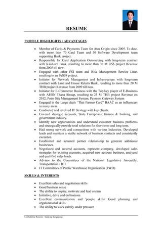This resume is for Sanpong Sangapong, who has over 10 years of experience in sales and business development roles in the IT industry in Thailand. He is currently the Head of Business Development and Client Relationship Management at NTT DATA, where he is responsible for increasing market share, achieving sales targets, and identifying new business opportunities. Previously he held several sales and management positions at Accellence, where he was responsible for developing client relationships, negotiating contracts, and delivering sales. He has a Master's degree in Public Administration and a Bachelor's degree in Business Administration.