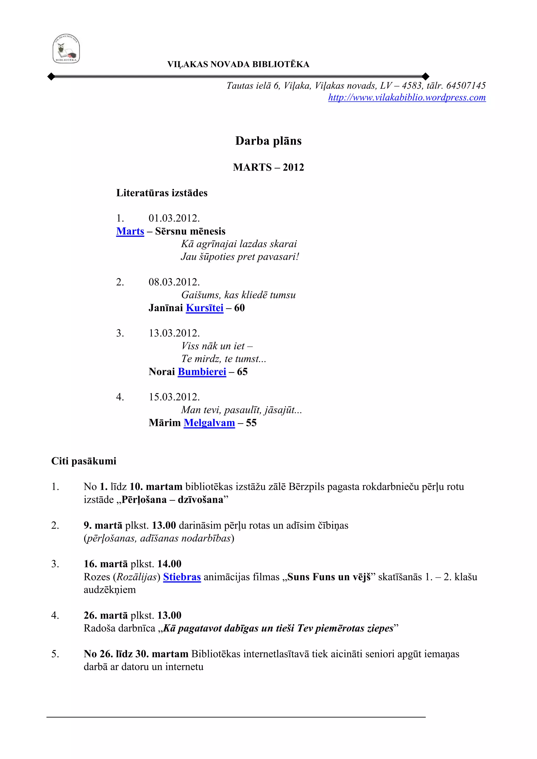 1. No 1. līdz 10. martam bibliotēkas izstāžu zālē Bērzpils pagasta rokdarbnieču pērļu rotu