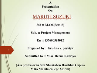 Maruti Suzuki is one of India's leading automobile manufacturers and market leader in the car segment. It was established in 1981 as a joint venture between the Government of India and Suzuki Motor Corporation of Japan. Maruti Suzuki produces and sells popular small cars like Maruti 800, Alto, Wagon R, Swift, SX4, and DZire. It has a large market share in India, selling over 730,000 cars annually. Maruti Suzuki has strengths in its large distributor network, affordable prices, low maintenance costs, and strong brand loyalty among Indian consumers. However, it also faces threats from increasing competition and rising fuel and raw material prices.