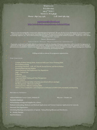 The resume is for a construction administration professional with over 20 years of experience in project management, administration, and operations management. She has a strong background in accounting, budgeting, purchasing, and legal and regulatory compliance. Her most recent role was as an executive assistant where she managed medical credentialing and regulatory filings. She holds certifications in safety and is pursuing a bachelor's degree in project management.