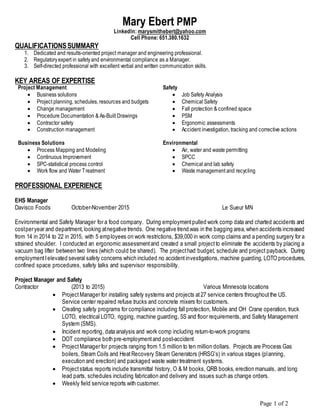 Mary Ebert's resume summarizes her experience and qualifications as a project manager, safety manager, and engineering professional with over 30 years of experience. She has extensive expertise in project management, safety, environmental compliance, process improvement, and regulatory requirements. Her background includes roles as an EHS Manager, Project Manager, Senior Engineer, and Safety and Environmental Manager for companies in various industries such as food processing, manufacturing, and energy production.