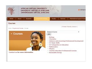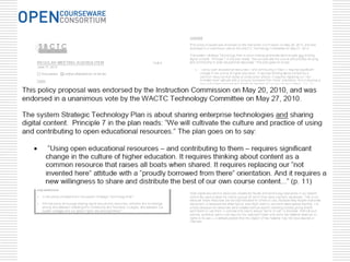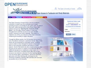The document discusses advancing formal and informal learning through openly sharing and using free, high-quality educational materials organized as courses via the OpenCourseWare Consortium. It aims to expand access to education by showcasing existing course materials and educational quality. The future of OCW includes enhancing self-learning tools, increasing faculty engagement through global issues, and developing new mobile platforms to improve accessibility. Case studies show countries using OER to increase affordable access, supplement curriculum, and advocate for recognizing OER production in university rankings.