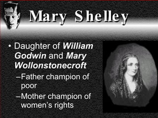 Mary Shelley wrote Frankenstein at a young age while staying with Lord Byron. She was influenced to write a ghost story during this time. Mary was the daughter of pioneering feminist Mary Wollstonecraft and political philosopher William Godwin. She married Percy Shelley when she was 17, though he was already married. Together they had close friends in Lord Byron and John Polidori, with whom they swapped ghost stories in Switzerland, inspiring Frankenstein. The novel became a classic of Romantic literature.