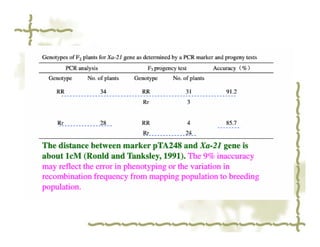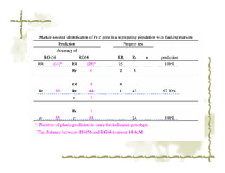 2. Marker-assisted selection is described as a method to select phenotypes based on the genotype of linked markers rather than the target gene itself. The advantages of MAS include time and cost savings compared to traditional field trials.