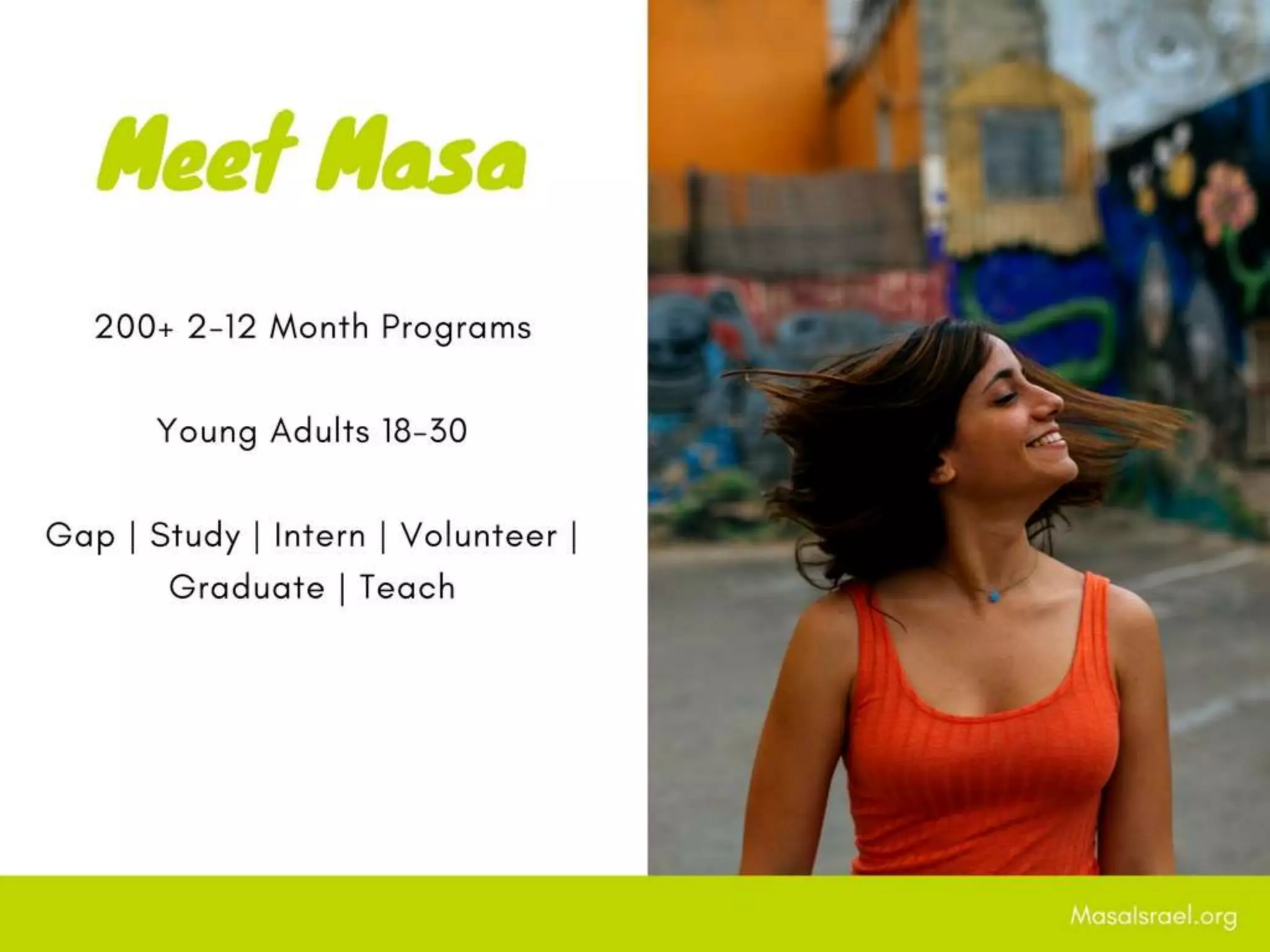 Masa Israel offers uniquely transformative experiences: we believe that Israel is the perfect platform for young adults ages 18-30 to explore, enjoy and develop skills to thrive in different lifestyles and scenarios.