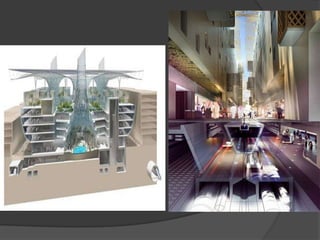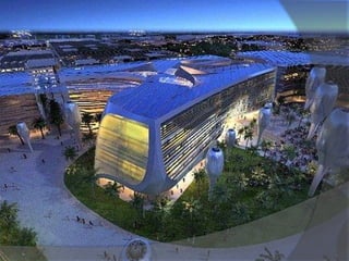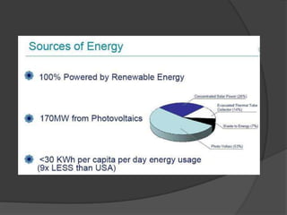 This document summarizes the objectives and design of Masdar City, an ambitious planned city in Abu Dhabi, United Arab Emirates that aims to be zero carbon, zero waste, and fossil fuel free by 2030. Key aspects of Masdar City covered include its focus on renewable energy like solar and wind power, its transportation system, and lifestyle for residents, with the overall goal of establishing a model for sustainable urban living.