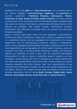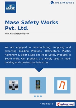 Mase Safety Works Pvt. Ltd. is an Indian company established in 2005 that manufactures, supplies, and exports road safety and construction products across South India and internationally. The company produces items like delineators, plastic and aluminum studs, road signs, and other products for road building and construction. Headquartered in Chennai, the company has various departments and a quality testing facility to manufacture products meeting international standards using advanced technology.