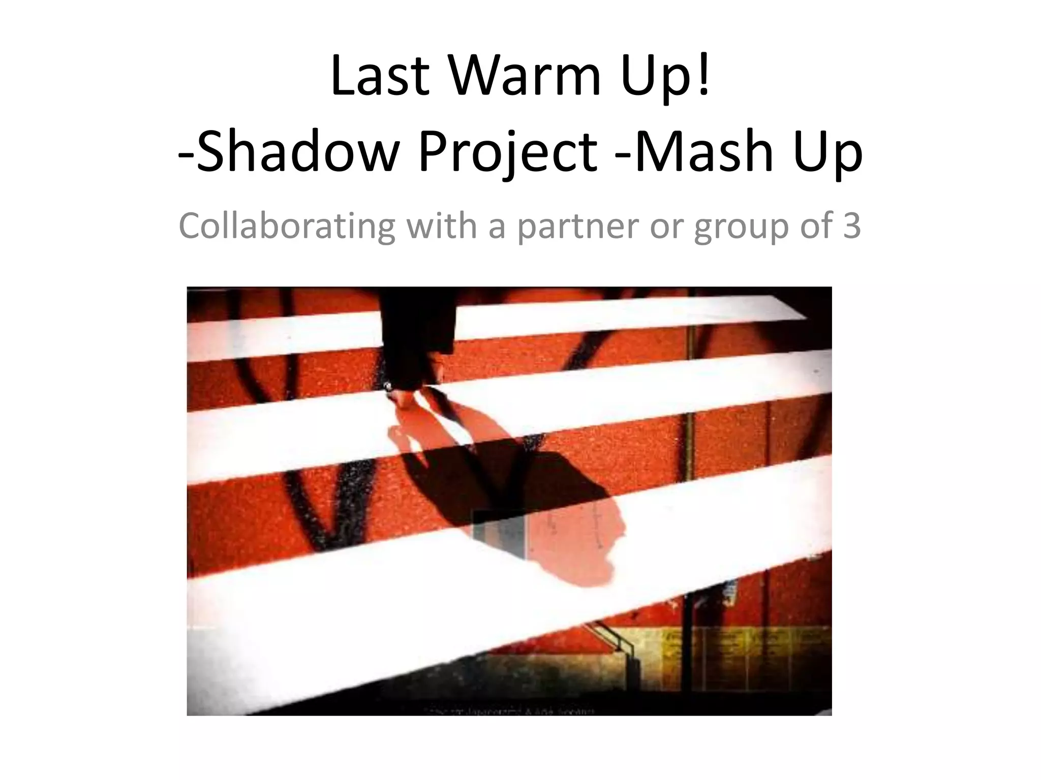 This document provides instructions for a shadow photo mash up collaboration. Students are asked to combine one of their shadow photos with another classmate's using techniques like the overlay, magnetic lasso tool, or layer mask. Examples are provided of past students' mash ups where they overlaid photos or used the magnetic lasso or layer masks. The final mashed up photos are due Monday and should be saved in a specific file format with the students' initials.