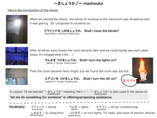 せんせい:ブラインドを しめましょうか。 Shall II close the blinds?