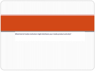 The UK Film Council, BBC Films, Vertigo Films, and Film Four are major film institutions in the UK that support the production and distribution of British films. The UK Film Council has backed over 900 films to make the UK a global center for film and supports new directors. BBC Films finds and develops new talent to produce independent British films. Vertigo Films creates commercially driven independent films using new technologies while paying attention to budgets. Film Four showcases British and international films and partners with Warp X Films to challenge films budgets and expand niche audiences. These institutions would likely distribute a UK-based social realist film.