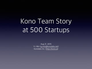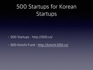 This document summarizes YJ Min's experience in 500 Startups Batch 13 accelerator program. It discusses 500 Startups and the 500 Kimchi Fund program for Korean startups, Konolabs' application and acceptance process, details of the 12 week program including location, support programs and networking opportunities. It also compares Silicon Valley to Korea and provides tips on demo day, fundraising, common startup questions, and gains and challenges of participating in the 500 Startups accelerator.