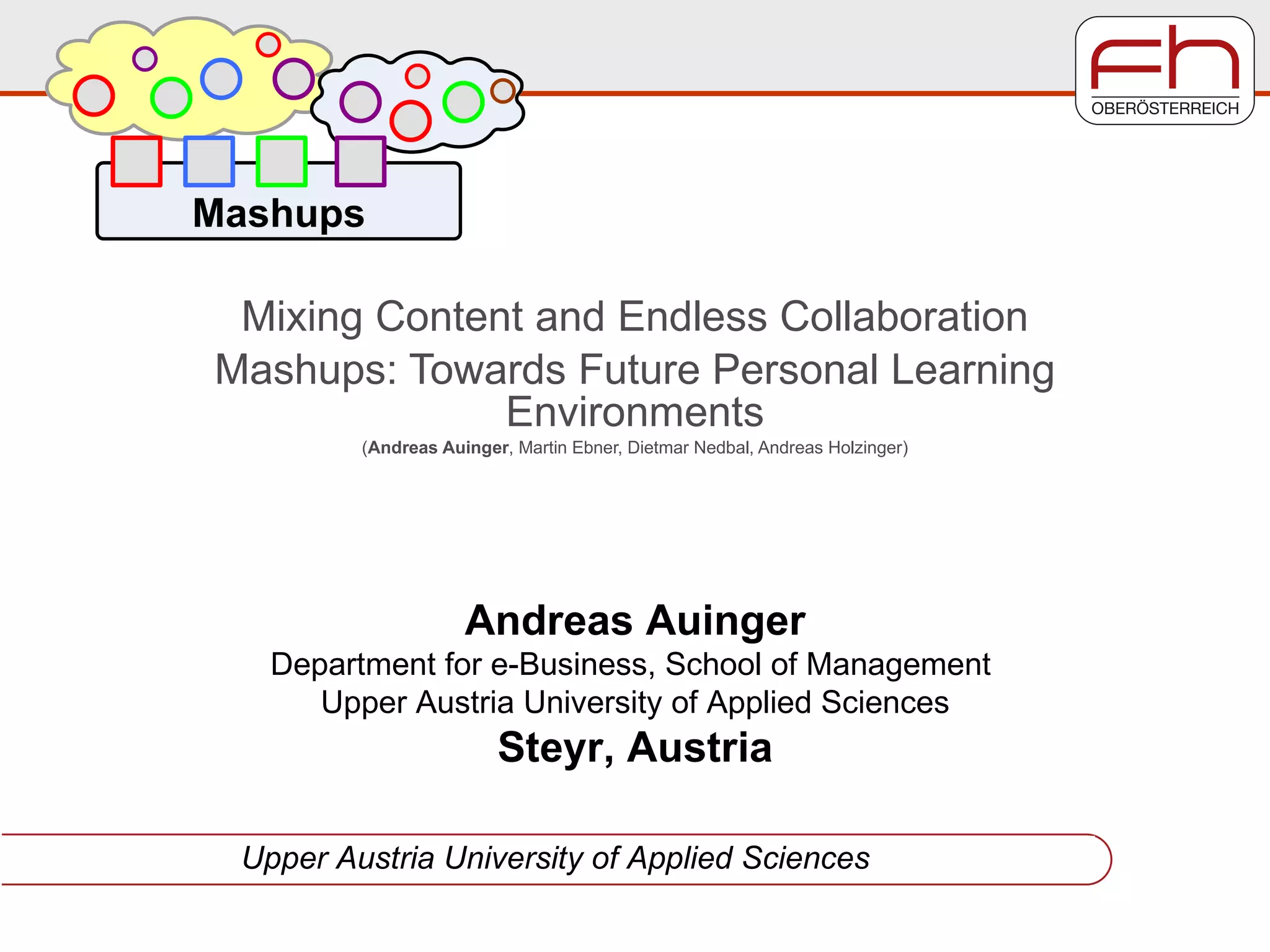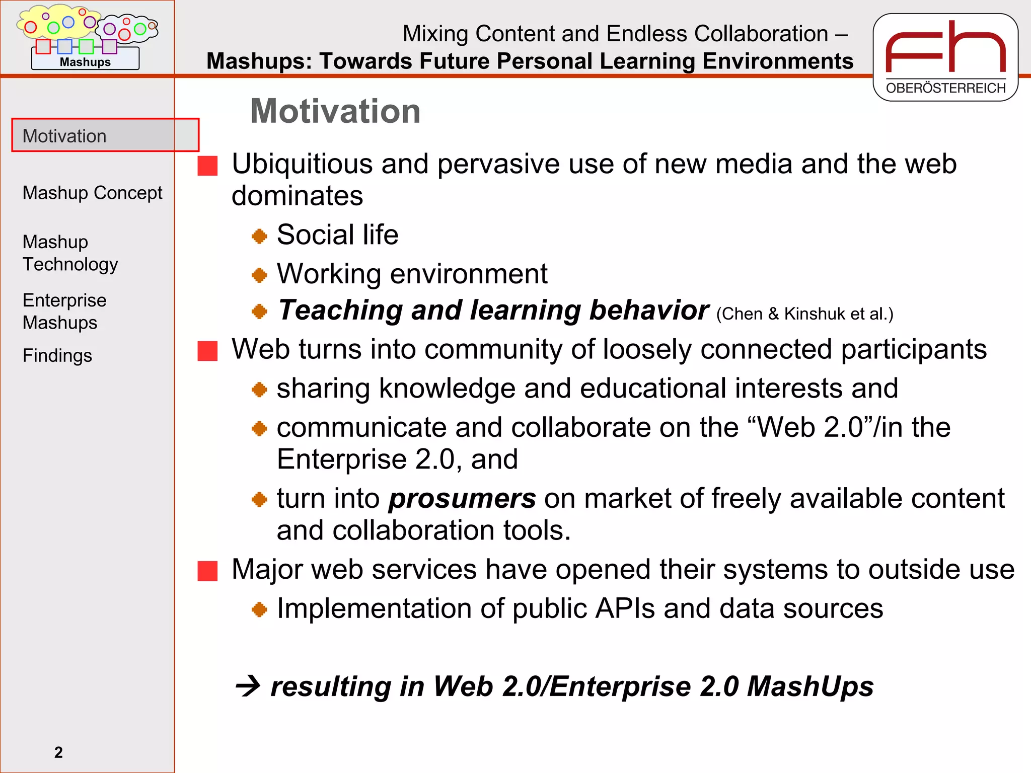 The document discusses the integration of web 2.0 tools and mashups into personal learning environments (PLEs), highlighting the impact of social media and collaboration technologies on education. It emphasizes the potential of these mashups to enhance traditional learning systems by allowing personalized content creation and improved communication among learners and educators. The future of learning applications is envisioned to shift from content distribution to personalized content aggregation, transforming the role of educators from content producers to facilitators.