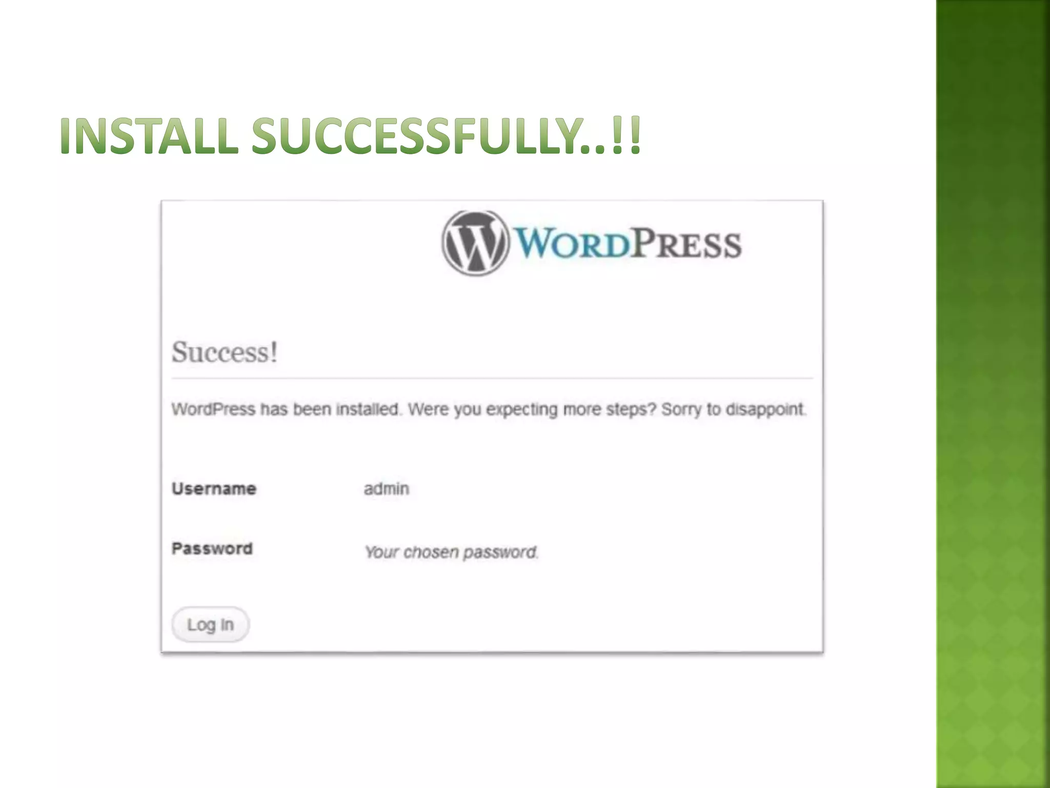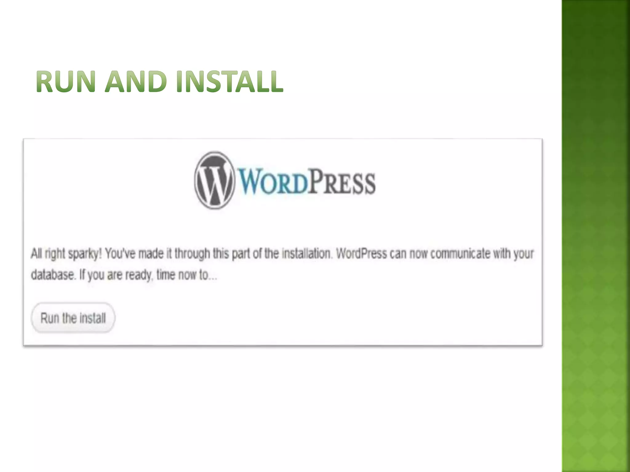 Wordpress is a powerful content management system that allows users to easily build, update, and manage dynamic websites and blogs. It started in 2003 and has grown to be the largest self-hosted blogging platform, used by millions of sites. Key features include an array of plugins, easy website creation, security, SEO friendliness, and responsive design capabilities. It can be used with Wordpress.org, which involves hosting and customization, or Wordpress.com for a free hosted blog with less customization options. Wordpress is installed using WAMP server, by extracting the Wordpress files into the server directory and configuring a database through PHPMyAdmin. Plugins add extra features and themes control the visual design of the