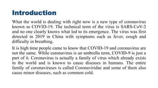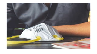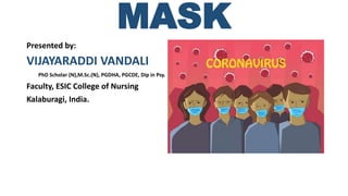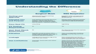 The document discusses different types of masks and their effectiveness against COVID-19. It describes surgical masks, N95 respirator masks, activated carbon masks, and cloth/sponge masks. Surgical masks help prevent large droplets but have gaps that allow viruses to enter. N95 respirators filter 95% of particles and are more effective, while activated carbon masks can filter some viruses but not very effectively. Cloth masks provide some protection but are less effective than other options. The document recommends masks for those with symptoms, at high risk, healthcare workers, and around infected individuals.