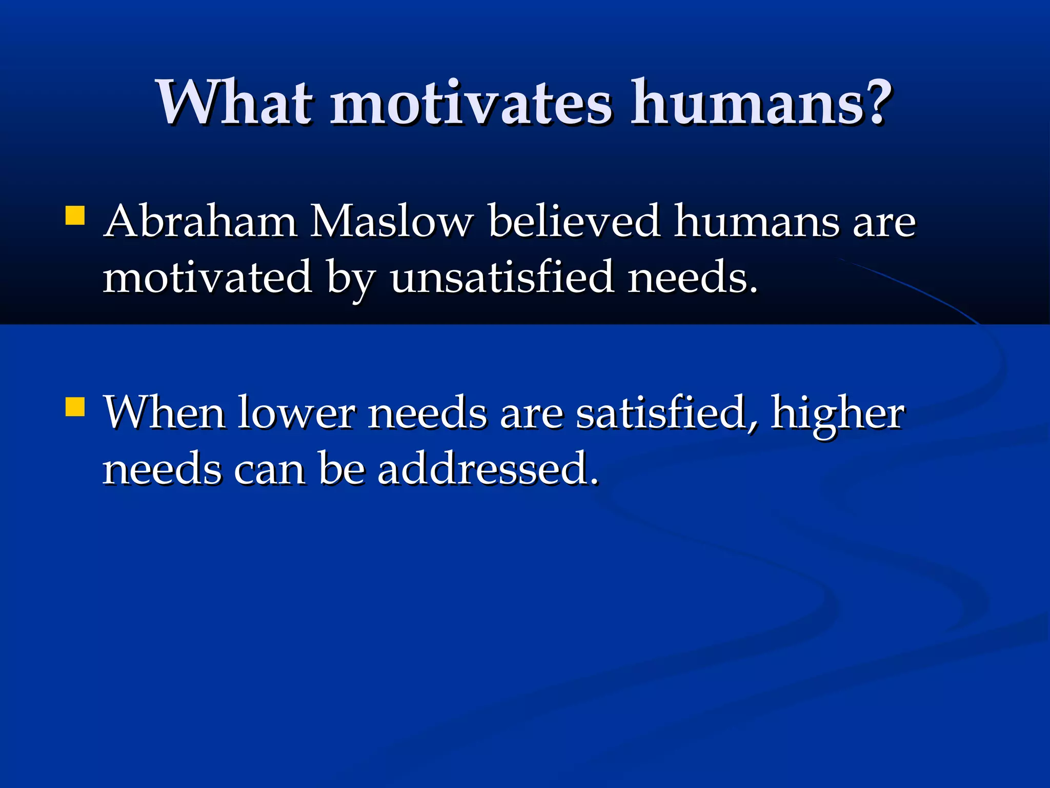 Abraham Maslow proposed a hierarchy of needs consisting of physiological needs, safety needs, love needs, esteem needs, and self-actualization needs. He believed humans are motivated to fulfill lower level needs before progressing to higher level needs, starting with basic physiological needs and moving up to needs for love, esteem, and self-fulfillment. The hierarchy suggests humans are motivated to fulfill unsatisfied needs and will address higher level needs like belongingness and esteem only once lower level needs are satisfied.