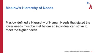 Maslow's hierarchy of needs proposes that humans have five categories of needs that must be met sequentially: physiological needs, safety needs, love and belonging needs, esteem needs, and self-actualization needs. Physiological needs are the most basic for survival, while self-actualization involves achieving one's full potential. Maslow believed lower level needs must be satisfied before progressing to meet higher level needs. The document provides descriptions of each category of needs in Maslow's hierarchy.