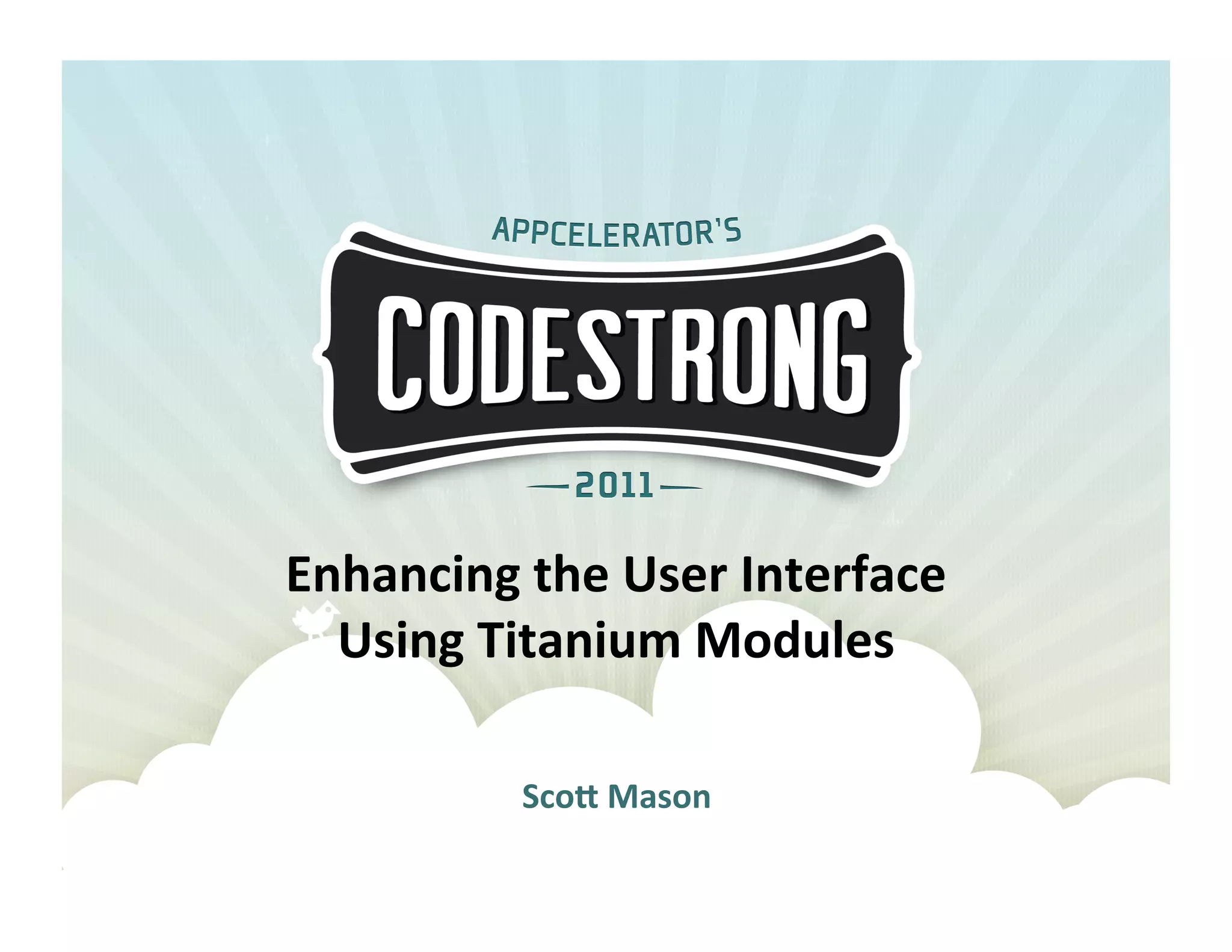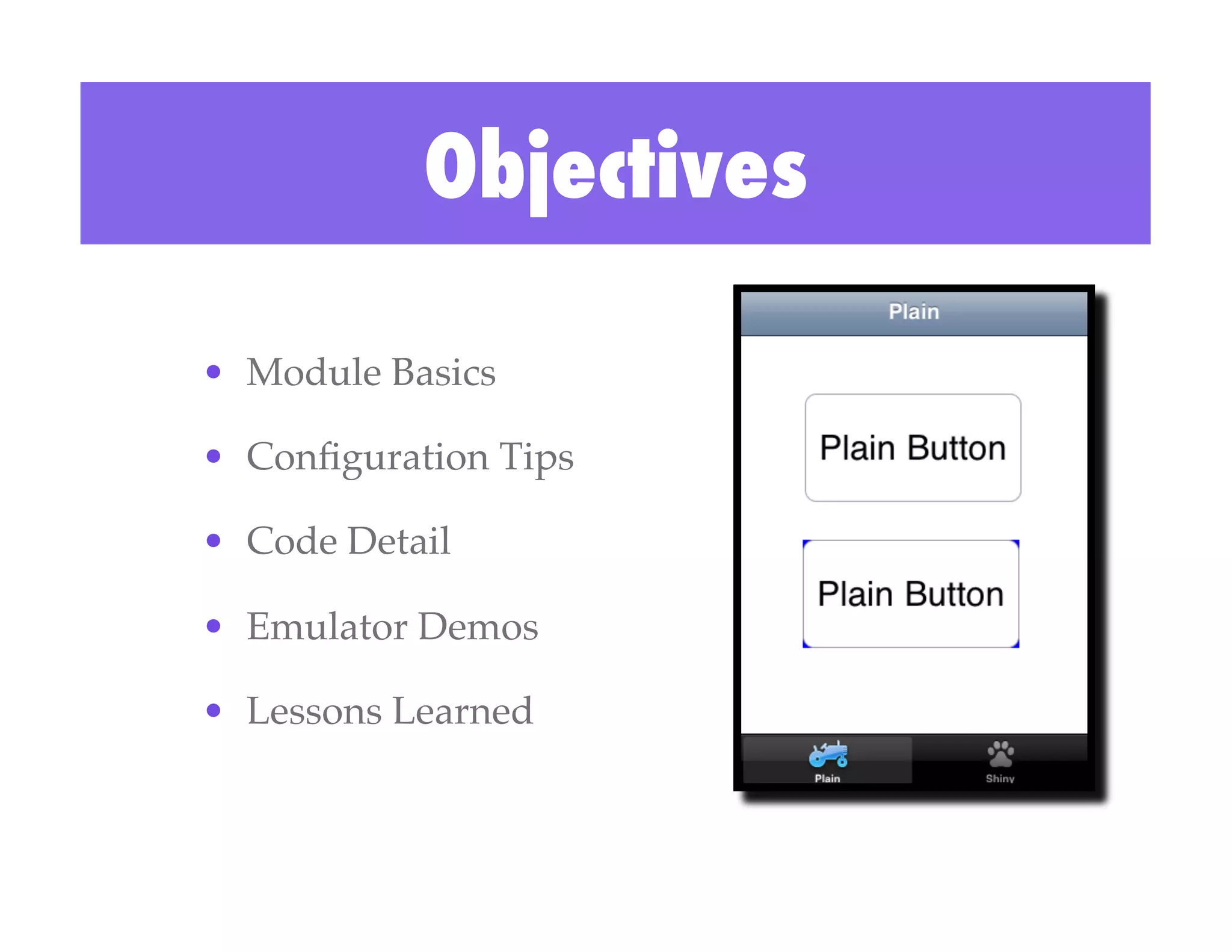 The document covers the development of user interface enhancements using Titanium modules, focusing on creating shiny buttons through detailed code examples for both iPhone and Android platforms. It provides configuration tips, deployment procedures for both operating systems, and insights gained during the development process. Additionally, it emphasizes the importance of understanding module documentation and adhering to naming conventions.