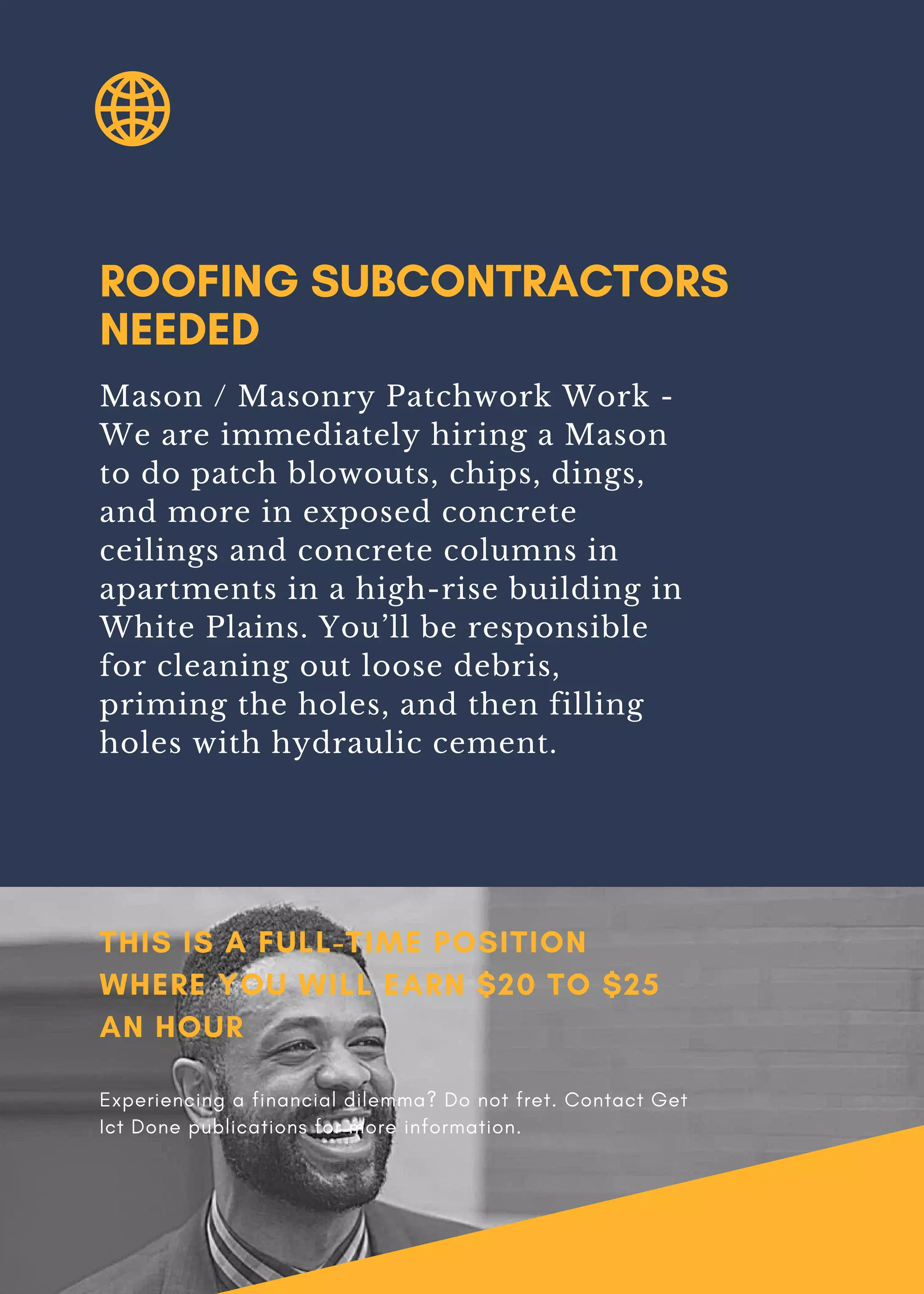 A roofing subcontractor is urgently needed for masonry patchwork in a high-rise building in White Plains. The mason will be responsible for repairing blowouts, chips, and dings in concrete ceilings and columns, with a pay rate of $20 to $25 per hour. Interested candidates can contact Get ICT Done Publications for more information.