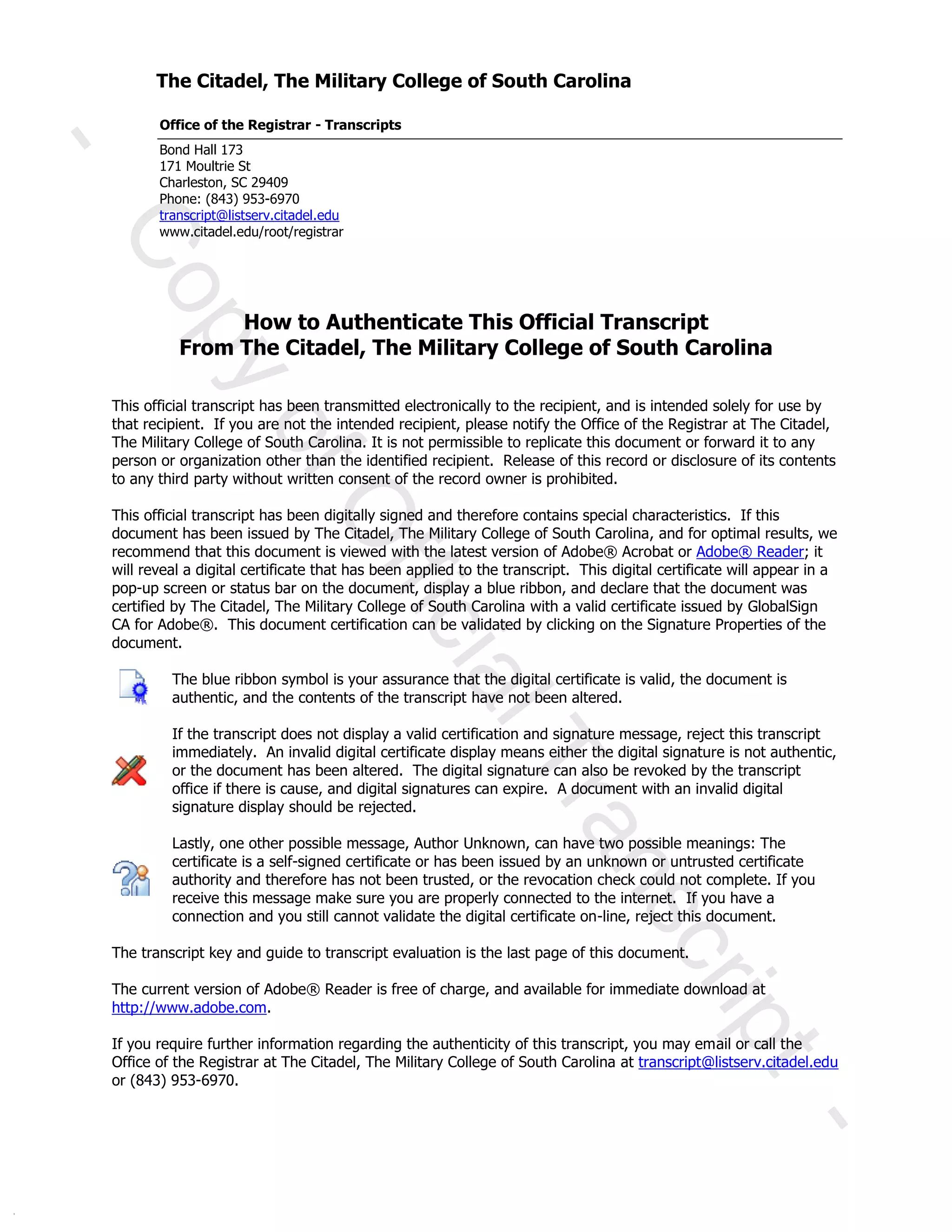 This document provides information about an official transcript from The Citadel, The Military College of South Carolina. It details courses completed by Andrea L. Mason in pursuit of a Master of Business Administration degree. The transcript is digitally signed and contains security features to validate its authenticity. Instructions are provided for verifying the digital signature and security features to confirm the transcript has not been altered.