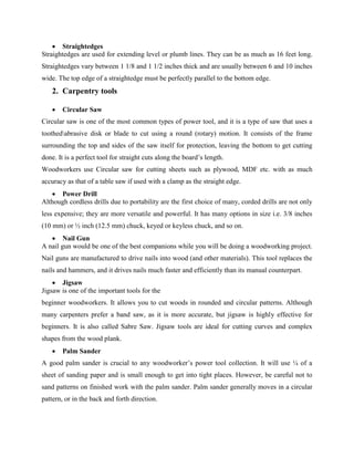 This document describes tools used by various craftspeople including masons, carpenters, plasterers and ceramicists. For masons, key tools described include trowels for spreading mortar, chisels for cutting brick, hammers for breaking brick, and levels for establishing plumb and level lines. For carpenters, circular saws, drills, nail guns and routers are highlighted. Plasterer tools discussed include trowels, buckets, floats, scrapers and spirit levels. Ceramicist tools mentioned are brushes, modeling tools, calipers and paddles/patters.