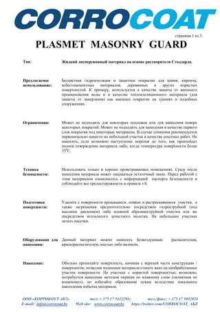 Документ описывает продукт 'Plasmet Masonry Guard', жидкий дисперсионный материал для гидроизоляции и защиты поверхностей, таких как камень и кирпич. Указывается способ нанесения, техники безопасности, а также ограничения в использовании, включая необходимость проверки совместимости с другими материалами. Материал имеет длительный срок хранения и подходит для применения в различных климатических условиях.