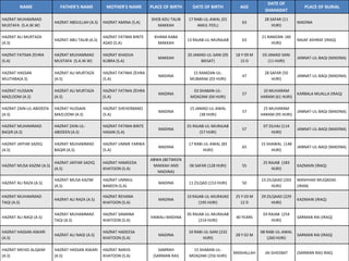 This document contains biographical information about important figures in Shia Islam, including the Prophet Muhammad, his daughter Fatimah, and the Twelve Imams. It provides their names, fathers' names, mothers' names, birthplaces, dates of birth, ages at death, and places of burial. The figures span from the 7th century to the 10th century and include spiritual leaders based in places like Madina, Makkah, Iraq, and Iran.