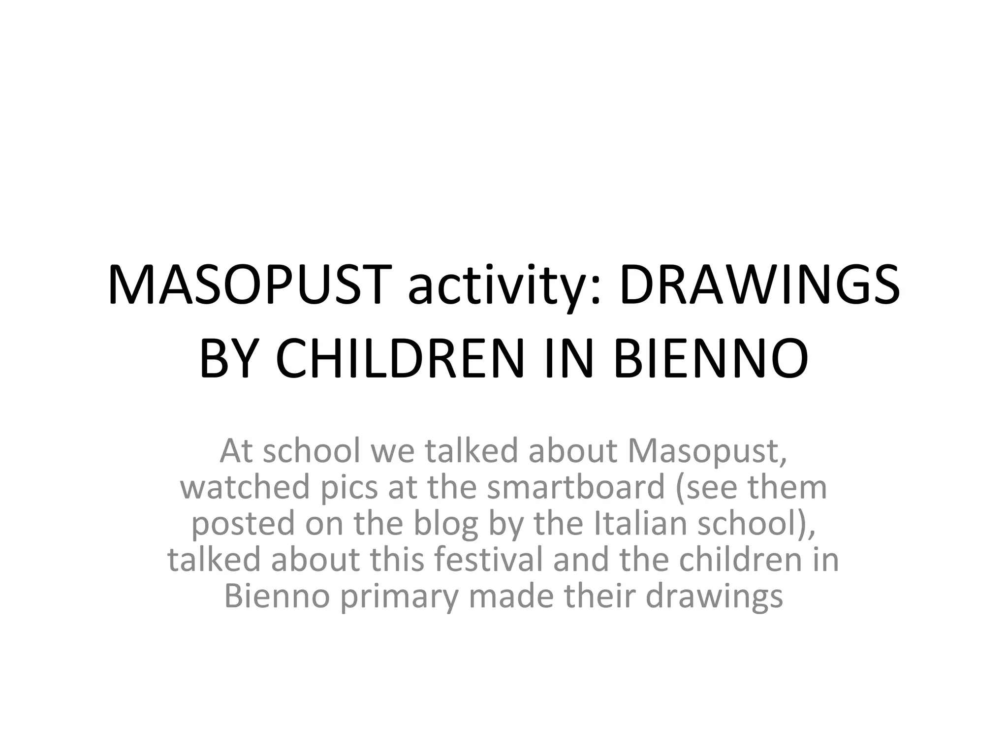 The children at an Italian primary school discussed the Masopust festival and watched pictures of it on a smartboard. They then made drawings based on what they learned about Masopust and the pictures they saw from a school in Bienno. The drawings from the children in Bienno primary school were posted on the school's blog.