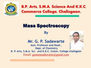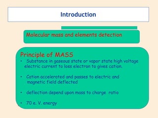 Mass spectroscopy is a technique used to identify molecules based on their mass. It works by ionizing molecules and then separating the resulting ions based on their mass-to-charge ratio. The document discusses the basic principles and instrumentation of mass spectroscopy. It explains how molecules are ionized by bombarding them with electrons, then the ions are accelerated and deflected based on their mass-to-charge ratios before being detected. Key aspects like molecular ion peaks, fragmentation patterns, and isotopic peaks are described to help interpret mass spectra.