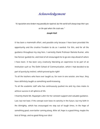 The document discusses the role of public relations (PR) in crisis management. It begins by providing background on PR, how it was born out of journalists seeking information from companies. PR aims to project a favorable public image for clients and create a favorable climate for marketing products/services. A key role of PR is crisis management - persuading management that reality must match the desired image, and communicating effectively during crises to maintain good relations with stakeholders. The document examines how PR is an important aspect of integrated marketing communications and will cover topics like digital PR, brand PR, and the changing PR landscape. It aims to emphasize PR's major role in crisis situations and that PR is more than just building relationships.