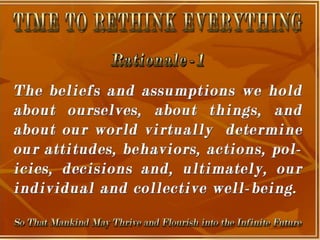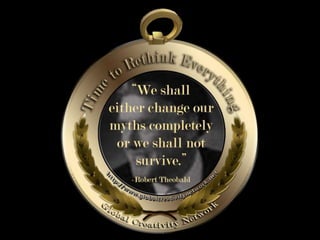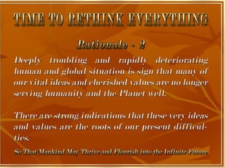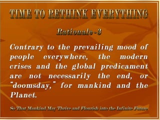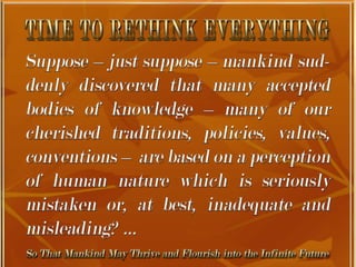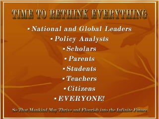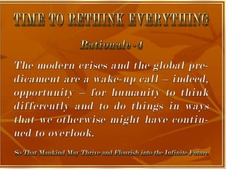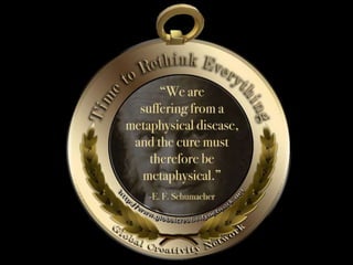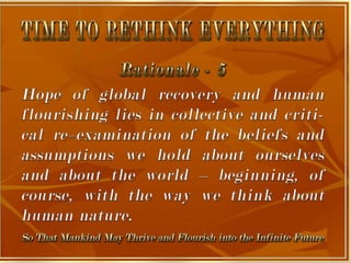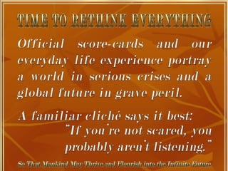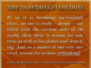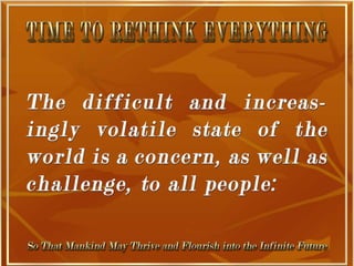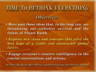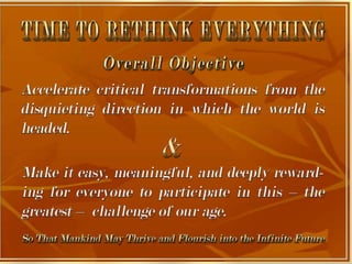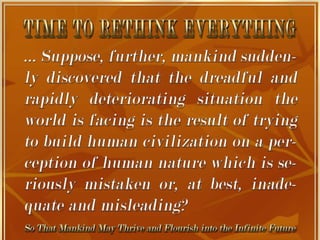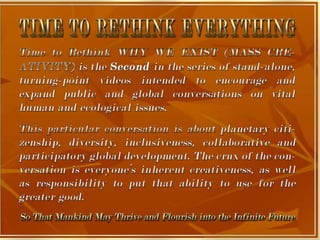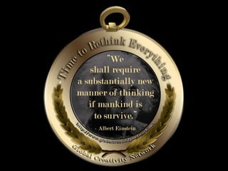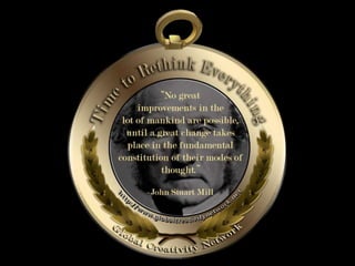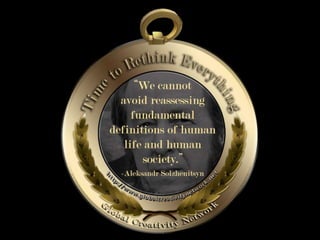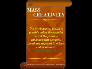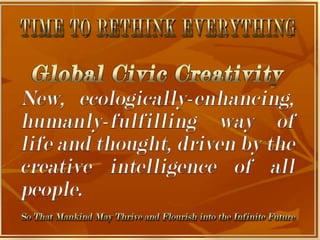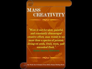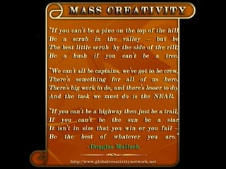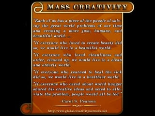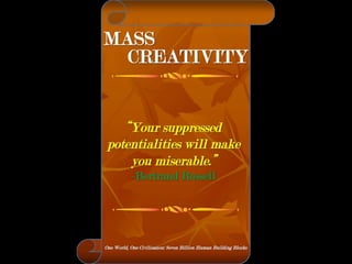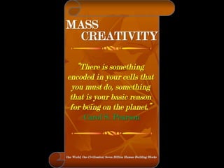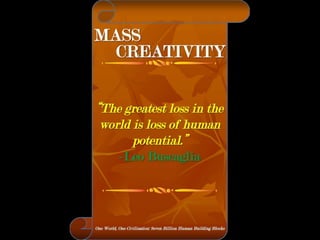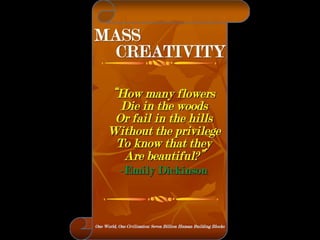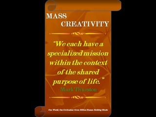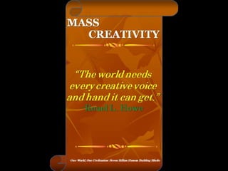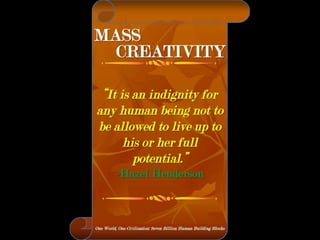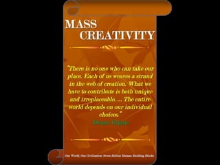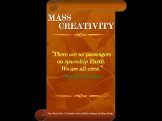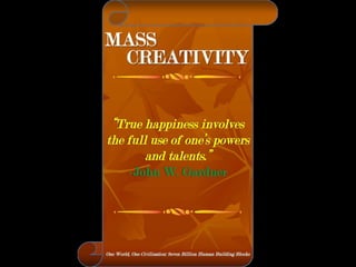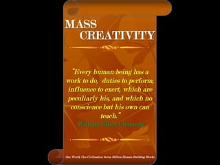 The document is a collection of quotes and passages that encourage mobilizing and engaging the creative intelligence of all people. It discusses themes of building a shared future together as one world and one civilization made up of seven billion human building blocks. The quotes provide perspectives on finding purpose, making contributions, and transforming challenges into opportunities through creativity.
