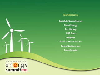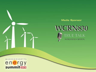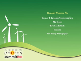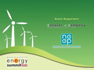 This document contains summaries of presentations from a Massachusetts Energy Summit on conservation and energy efficiency. It lists speakers from organizations like National Grid, the Institute of Contemporary Art Boston, MassMutual Financial Group, Mount Wachusett Community College, ISO New England, and the Massachusetts Secretary of Energy and Environmental Affairs office. The document provides information on various energy efficiency projects, incentives, and issues relating to the electric grid.