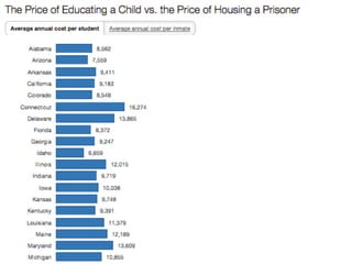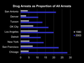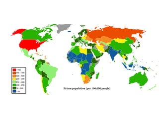 The document discusses mass incarceration, drawing parallels between the 'old' and 'new' Jim Crow, particularly in the context of the war on drugs and systemic racial bias. It highlights statistics indicating the disproportionate targeting of non-white individuals and critiques common myths about the causes of incarceration. Additionally, it emphasizes the societal and psychological factors contributing to crime and the detrimental impacts of prison on individuals and communities.