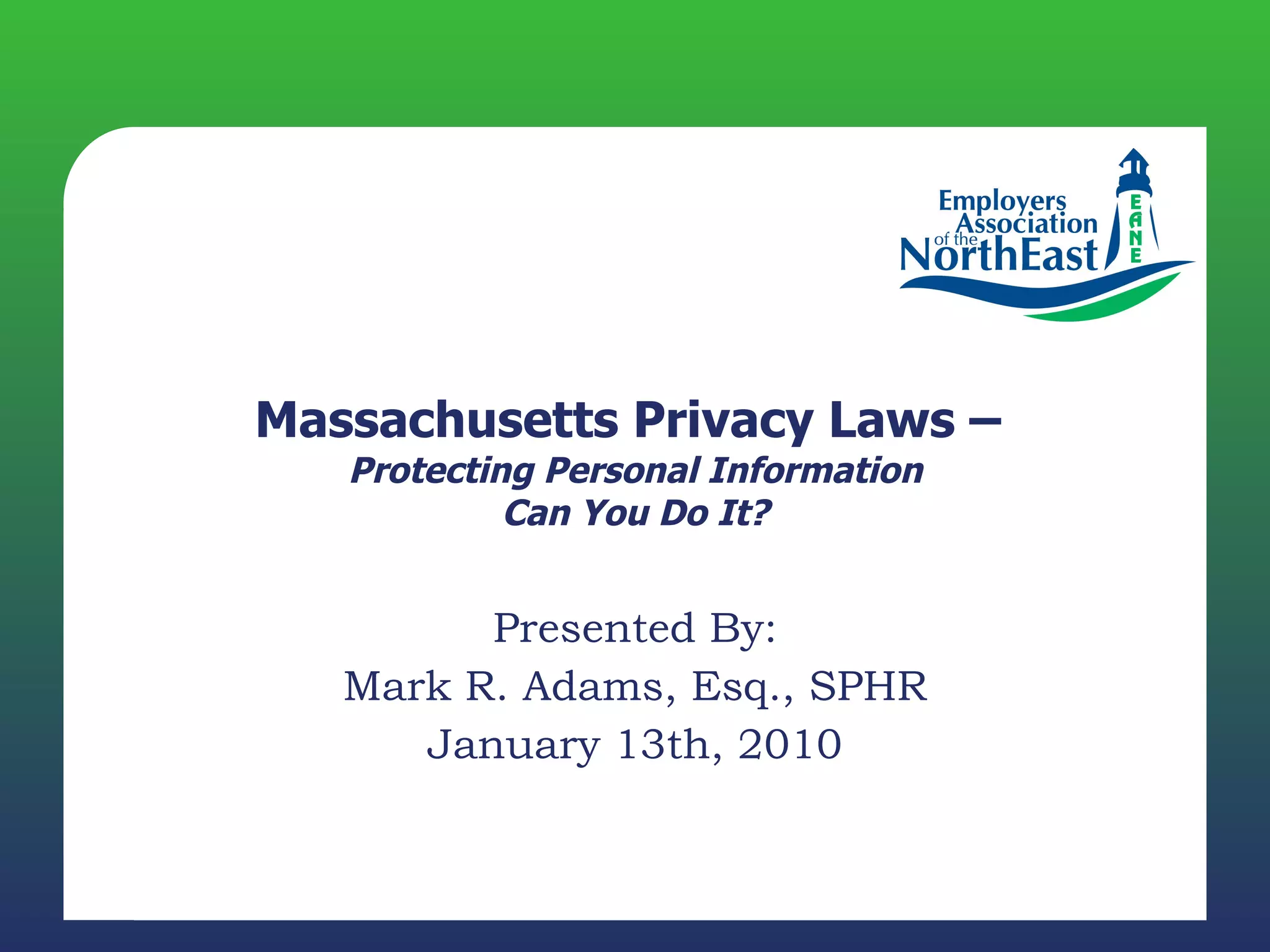 This document summarizes Massachusetts privacy laws regarding the protection of personal information. It outlines key aspects of the Massachusetts Data Protection Law and Comprehensive Written Information Security Program (CWISP) requirements, including defining personal information, risk assessment, information storage, policy development, third party compliance, access limitations, monitoring, and penalties for non-compliance. Employers are required to implement security programs, limit data access, train employees, and properly destroy records to protect personal information.