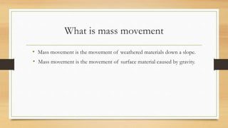 Mass movement is the movement of weathered materials down a slope due to gravity. There are several kinds of mass movement, including soil creep, solifluction, landslides, rockfalls, mud flows, and slumps. Soil creep is the slow movement of soil down slopes at a rate of 1mm per year. Landslides occur when a large mass of land breaks loose and slides down a slope, often causing significant damage. Rockfalls involve very rapid movement of materials on steep slopes due to weathering or earthquakes.