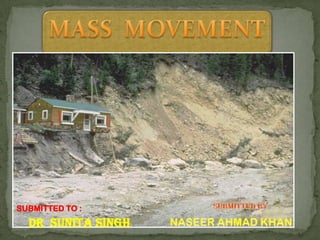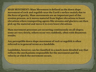 Mass wasting refers to the downslope movement of rock and soil due to gravity. It occurs when gravitational forces exceed the frictional or shear strength of the material. The document discusses the key factors that influence mass wasting, including slope steepness, water content, vegetation, and earthquakes. It also describes different types of mass wasting processes such as slides, flows, slumps, creeps, and falls, which are classified based on the material and speed of movement. The document emphasizes that mass wasting is an important geologic hazard, and outlines some methods to lessen its effects, such as removing weight from slopes, using engineering controls, and stabilizing slopes with vegetation.